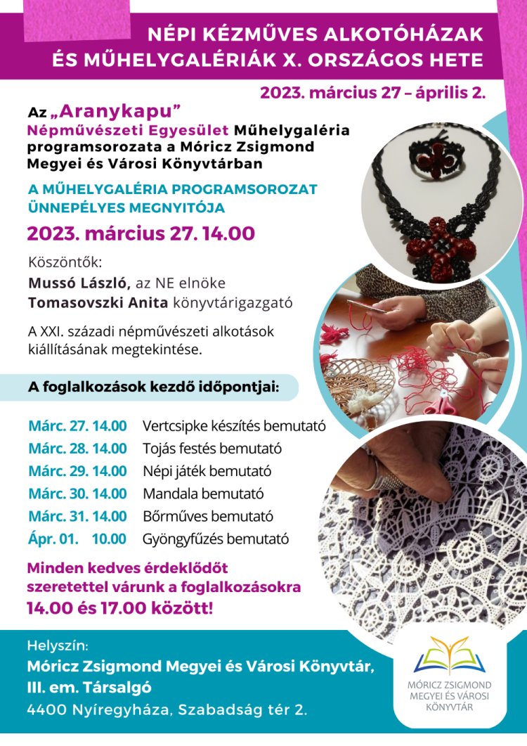 Az „Aranykapu” Népművészeti Egyesület Műhelygaléria programsorozata a Móricz Zsigmond Megyei és Városi Könyvtárban várja majd színes programokkal az érdeklődőket.