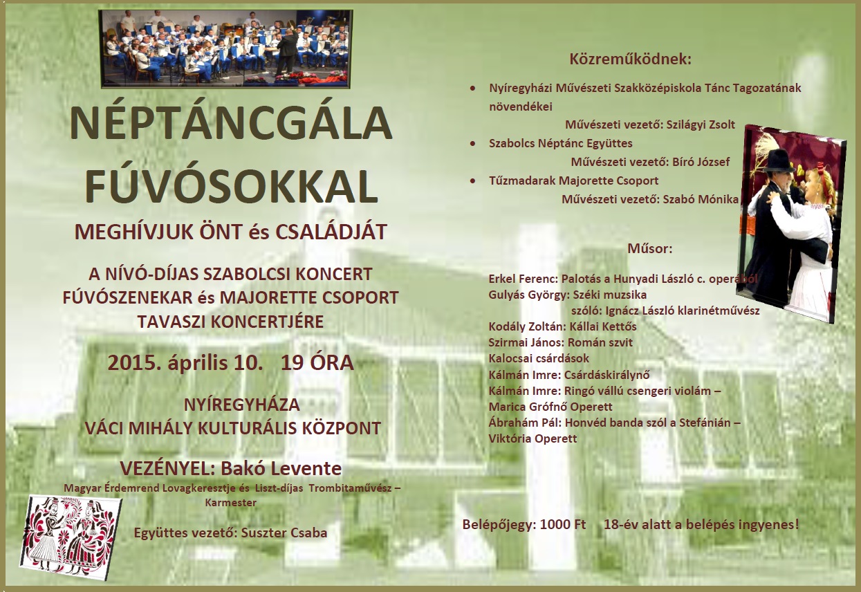 A Szabolcsi Koncert Fúvószenekar és Majorette Csoport tavaszi koncertje április 10-én a Váci Mihály Kulturális Központban.