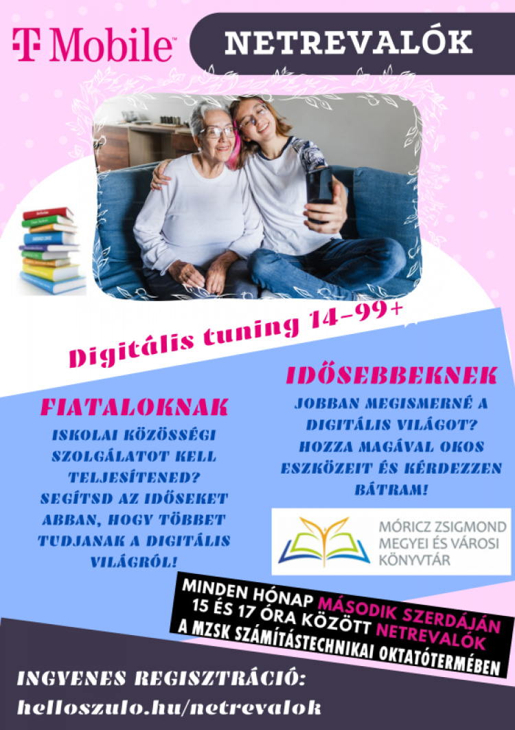 A www.helloszulo.hu/netrevalok oldalon történő regisztrációt követően a diákok és az idősek is online jelentkezhetnek, vagy telefonon és személyesen is van lehetőségük az Olvasóteremben (1. emelet).