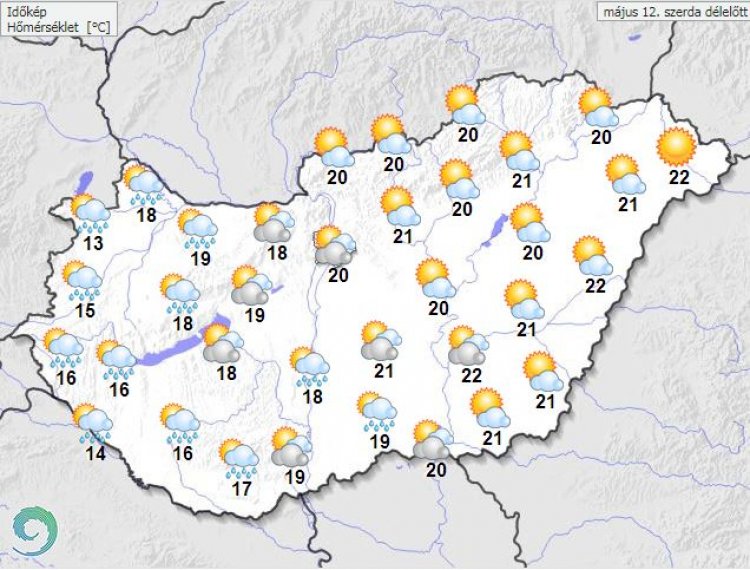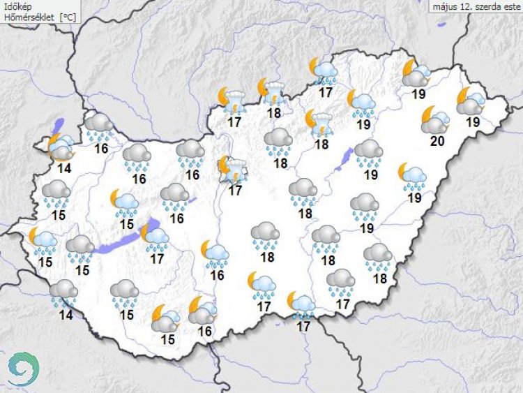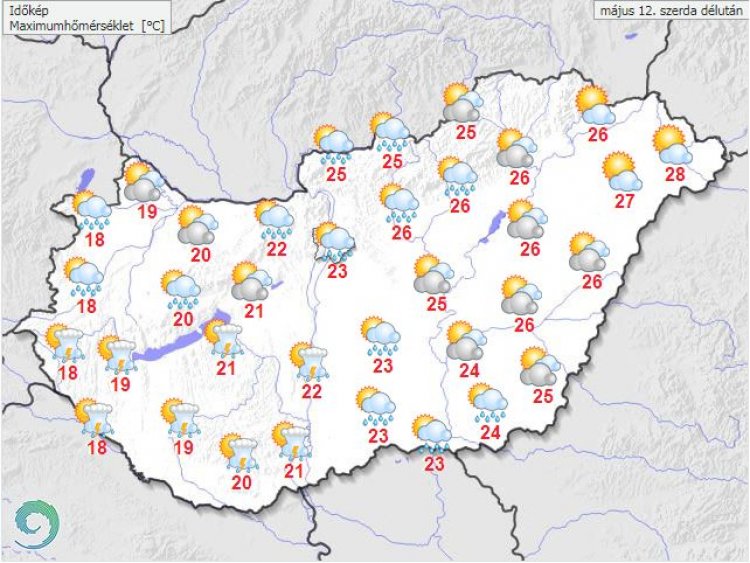 A szél délnyugatira, az Északnyugat-Dunántúlon északnyugatira fordul, megélénkül, néhol megerősödik, de zivatarok környezetében viharos lökések is lehetnek. A legmagasabb nappali hőmérséklet a csapadékosabb nyugati tájakon 16, 21, máshol 22 és 28 fok között alakul. Késő estére 12 és 19 fok közé hűl le a levegő.