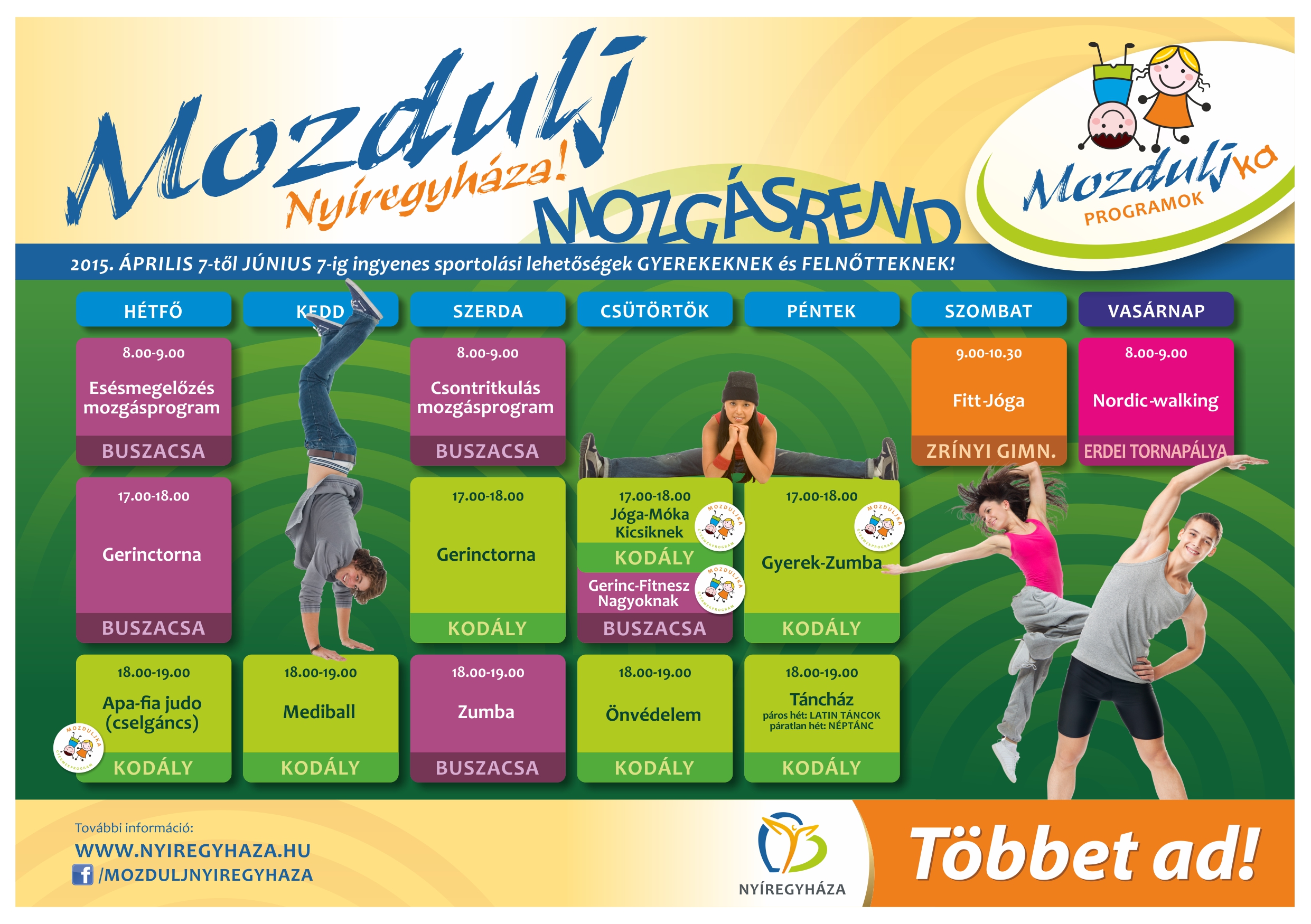 2013. november elején indult el először városunkban a kicsiket és nagyokat, fiatalokat és idősebbeket összefogó, illetve megmozgató szabadidős és sportprogram, a Mozdulj Nyíregyháza! Az ingyenes programsorozatot Nyíregyháza Megyei Jogú Város Önkormányzata kezdeményezte. A programsorozat népszerűsége már több mint egy év távlatából is töretlen, hiszen egy-egy foglalkozáson több tucat nyíregyházi vesz részt. Dr. Kovács Ferenc azt mondta, a szervezők és a résztvevők azzal keresték meg, hogy lehetőség szerint továbbra is folytatódjon az eredetileg április 5-ig tervezett programsorozat, mely oly sokaknak rendszeres sportolási lehetőséget jelent. Az elmúlt napok egyeztetéseinek pedig meglett az eredménye: Nincs megállás! Tavasszal is – Mozdulj, Nyíregyháza. Egy-egy mozgásformával továbbra is a hét azonos napján várják az érdeklődőket.