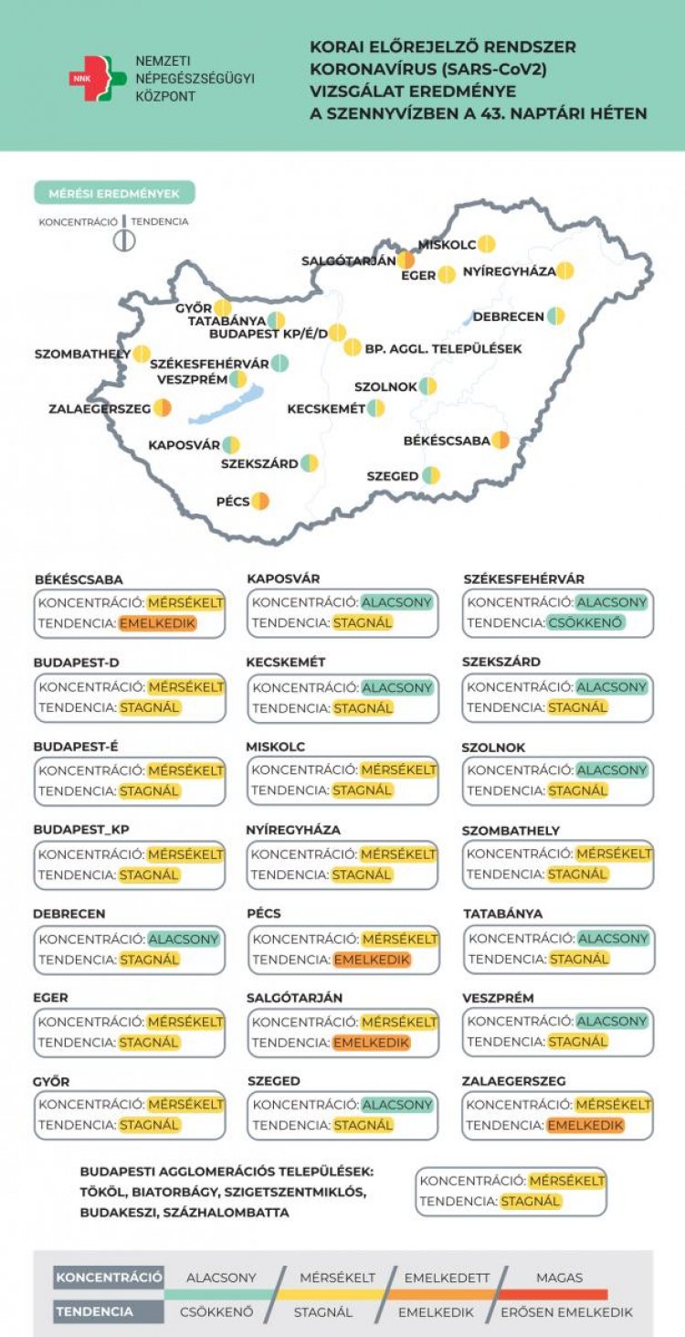 A 43. héten az ország legtöbb településén, így a fővárosban és az agglomerációban is stagnál a koronavírus szennyvízben mért koncentrációja, míg néhány nagyvárosban (Pécs, Békéscsaba, Salgótarján, Zalaegerszeg) a tendencia emelkedő.