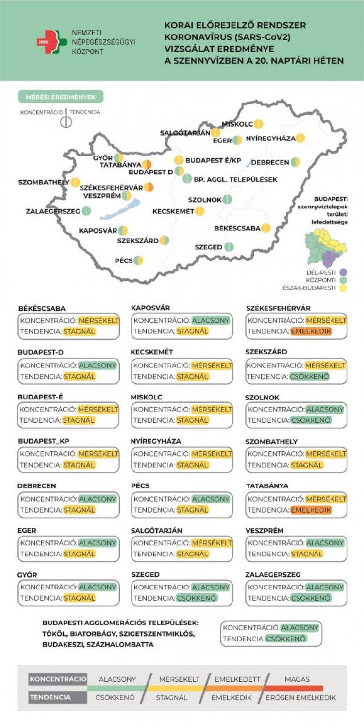 A vizsgált helyszínek közül Szeged, Szekszárd, Szolnok, Zalaegerszeg, valamint az öt Budapest környéki település (Tököl, Biatorbágy, Szigetszentmiklós, Budakeszi, Százhalombatta) közös mintája mutat csökkenő tendenciát, ugyanakkor enyhe emelkedés tapasztalható Székesfehérváron és Tatabányán. A 22 vizsgált szennyvíz-minta közül 11-nél alacsony, 11-nél mérsékelt koronavírus-koncentráció volt mérhető.