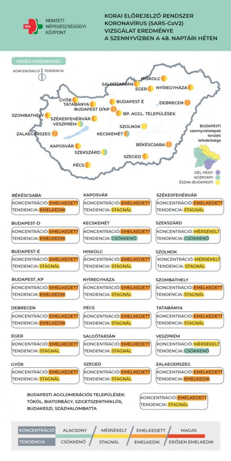 A vizsgált mintavételi helyek közül emelkedő tendencia a Budapest Déli és Központi Szennyvíztisztító Telep mintájában, valamint Békéscsabán, Debrecenben és Zalaegerszegen figyelhető meg, míg csökkenés Kecskeméten, Szekszárdon és Veszprémben észlelhető. A SARS-CoV-2 örökítőanyag koncentrációja 3 mintavételi helyen a mérsékelt, míg 19 városban az emelkedett tartományba esik.
