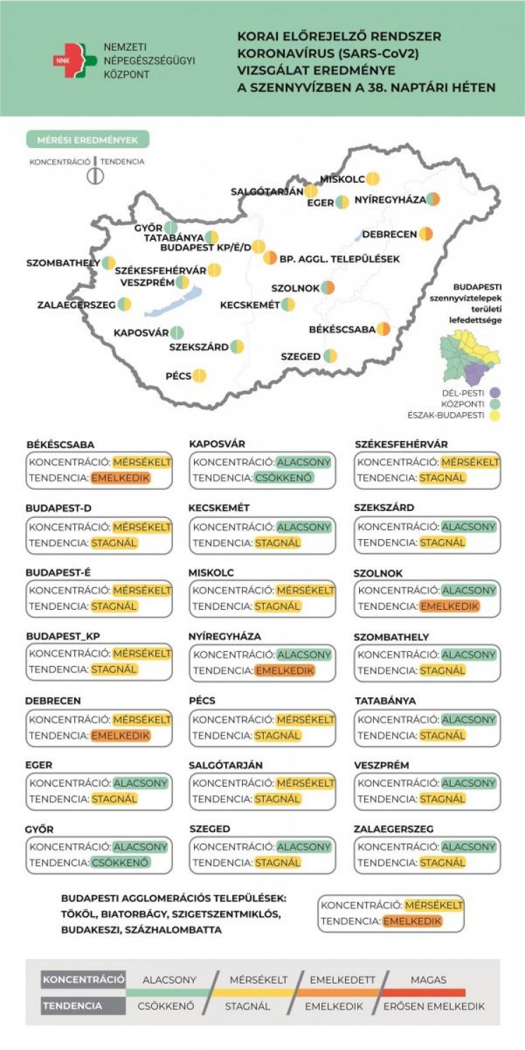A 38. héten a vizsgált magyarországi városok többségét stagnáló tendencia jellemezte, enyhe emelkedés látható Békéscsabán, Debrecenben, Nyíregyházán, Szolnokon, valamint a Budapest környéki agglomerációs települések - Tököl, Biatorbágy, Szigetszentmiklós, Budakeszi, Százhalombatta - közös mintájában. Csökkenés Győrött és Kaposváron volt megfigyelhető.
