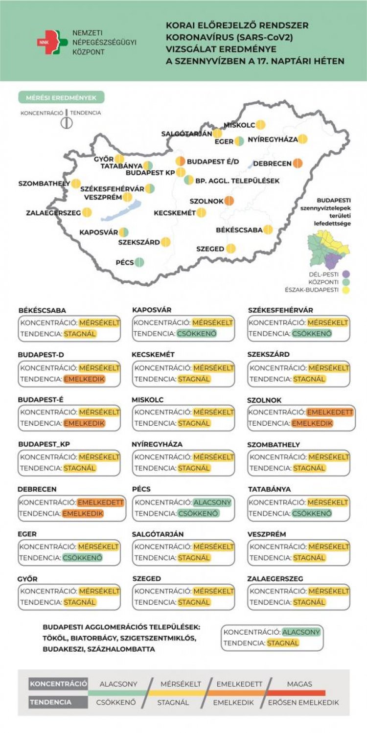 A legtöbb vizsgált város szennyvizét stagnáló tendencia jellemzi. Amíg Budapest északi és déli szennyvíztisztító ellátási területén, valamint Debrecenben és Szolnokon ismét emelkedett a szennyvízben mért koronavírus-örökítőanyag mennyisége, addig más településeken - Egerben, Kaposváron, Pécsett, Székesfehérváron és Tatabányán - csökkent.