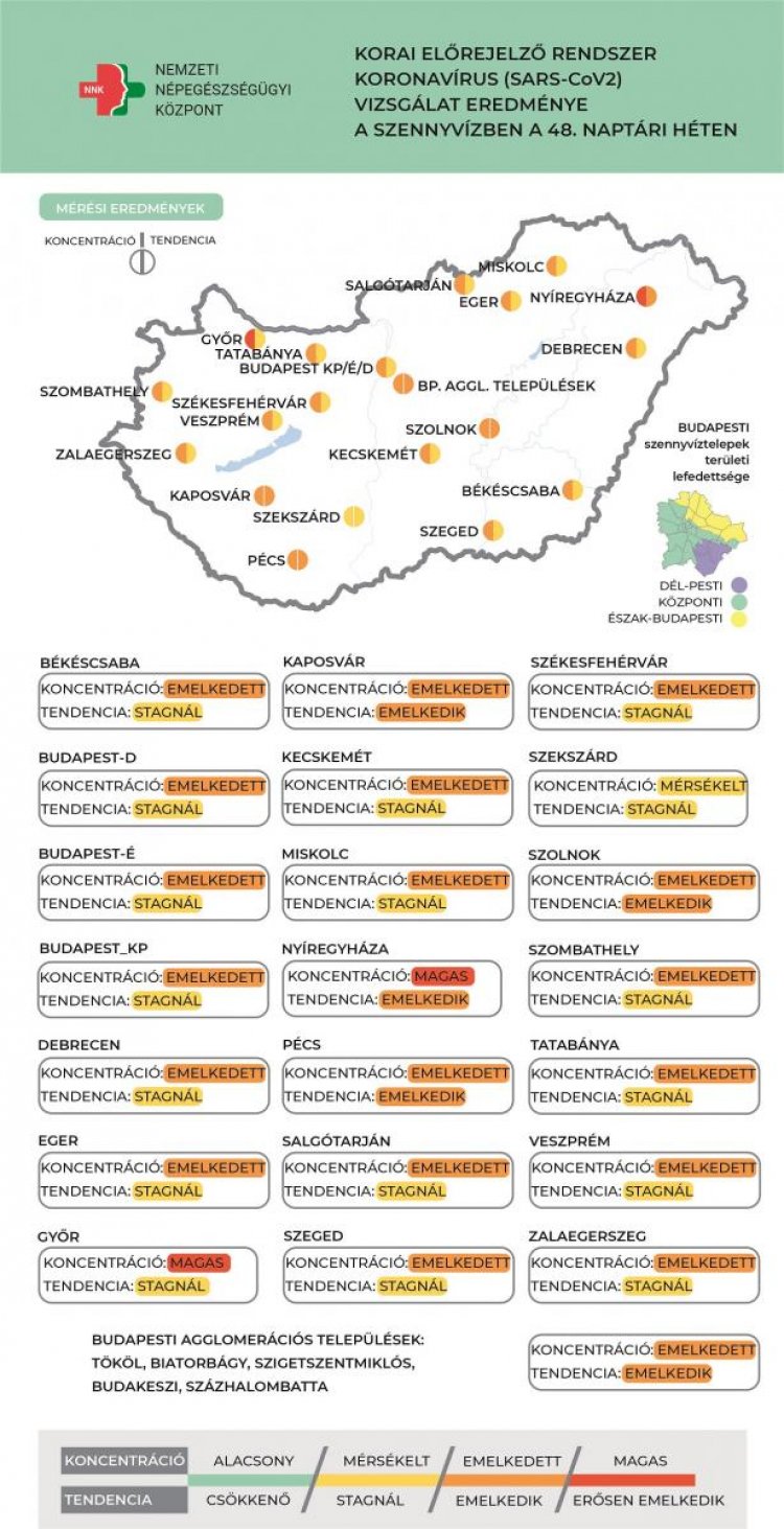 A vírus-örökítőanyag koncentráció két település (Győr és Nyíregyháza) esetében a magas koncentráció tartományba esik, míg 19 mintavételi helyen az emelkedett, egy településen a mérsékelt kategóriába sorolható.