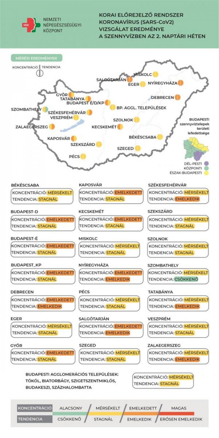 A szennyvíz SARS-CoV-2 örökítőanyagának koncentrációja országos átlagot tekintve ismét enyhe emelkedést mutat. A vizsgált városok közül emelkedő tendencia Debrecen, Nyíregyháza, Salgótarján, Székesfehérvár, Tatabánya és Zalaegerszeg esetében látható, míg Szombathelyen enyhe csökkenés tapasztalható.