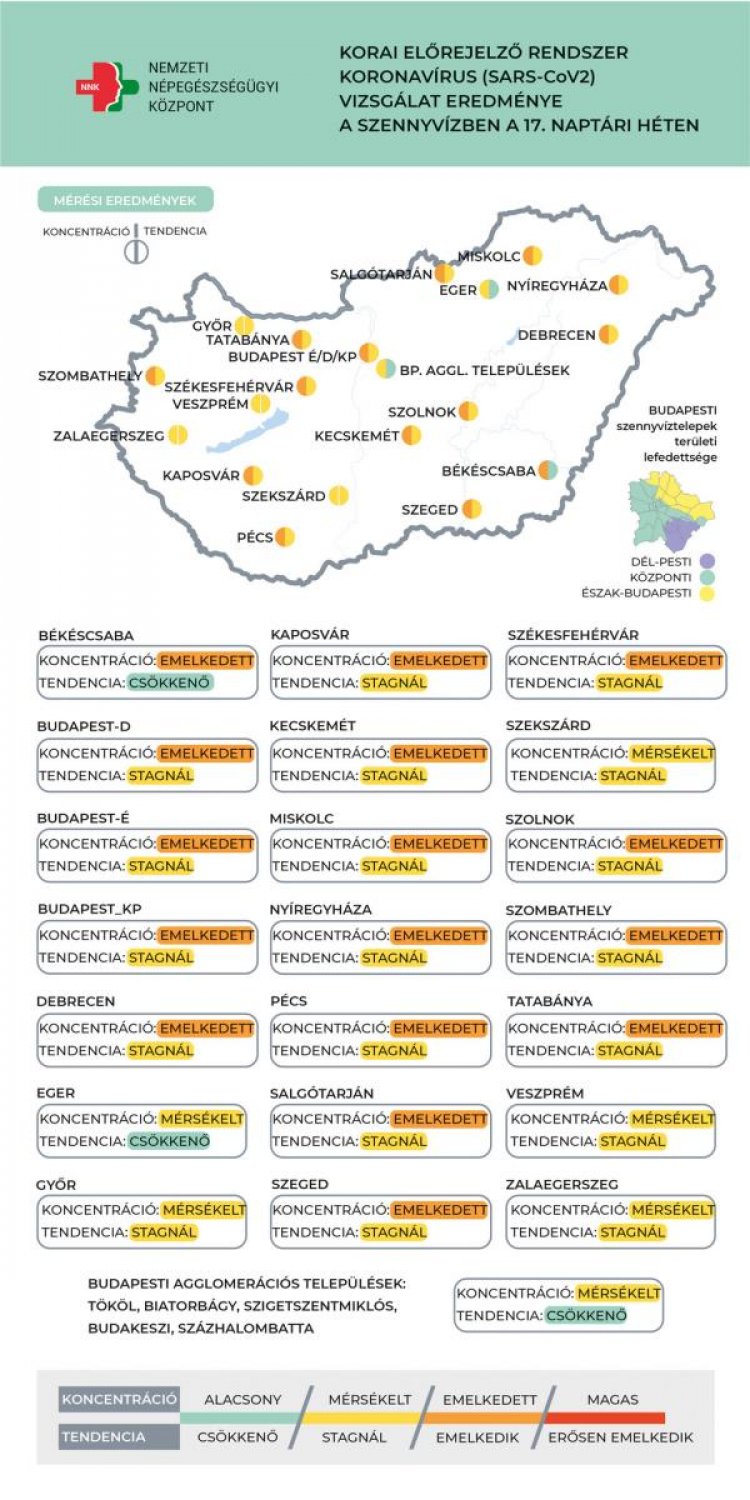 A koronavírus-örökítőanyag koncentrációja hat városban a mérsékelt, 16 mintavételi helyen az emelkedett kategóriába esik. A vizsgálati eredmények összességében a járvány leszálló szakaszára jellemző "ingadozva csökkenő" tendenciát mutatnak - írták.