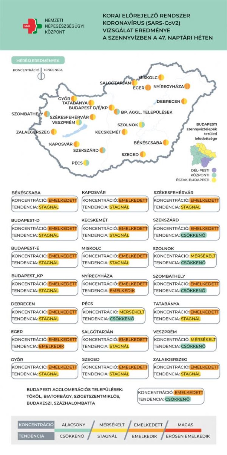 A vizsgált városok többségét stagnáló tendencia jellemzi, emelkedés Egerben és Nyíregyházán látható, míg csökkenés a Budapest környéki agglomerációs települések közös mintájában (Tököl, Biatorbágy, Szigetszentmiklós, Budakeszi, Százhalombatta), valamint Pécsett, Szekszárdon, Szolnokon, Szombathelyen és Veszprémben figyelhető meg. A SARS-CoV-2 örökítőanyag koncentrációja három településen a mérsékelt, míg 19 mintavételi helyen az emelkedett tartományba esik.