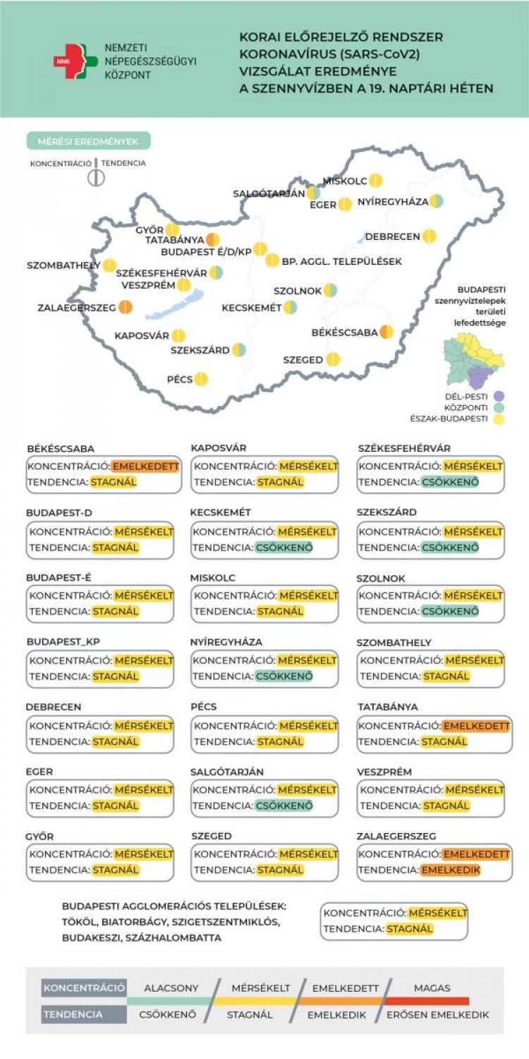 Azt írták, a szennyvízmintákban a koronavírus örökítőanyagának koncentrációja országos átlagban további csökkenést mutat.
