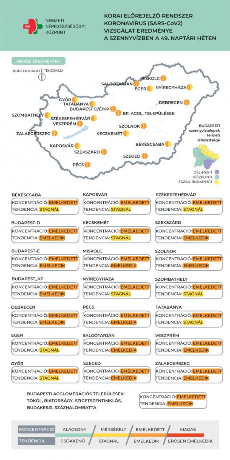 A vizsgált városok többségénél emelkedő tendencia figyelhető meg: Budapest mindhárom szennyvíztisztító telepének ellátási területén, a Budapest környéki agglomerációs településeken, Debrecenben, Miskolcon, Pécsett, Salgótarjánban, Szegeden, Szekszárdon, Szolnokon, Veszprémben és Zalaegerszegen. A mért eredmények 9 helyszínen stagnáló tendenciát mutatnak, míg csökkenés egyetlen vizsgált mintavételi helyen sem mérhető. A SARS-CoV-2 örökítőanyag koncentrációja minden vizsgált helyszínen az emelkedett tartományba esik.