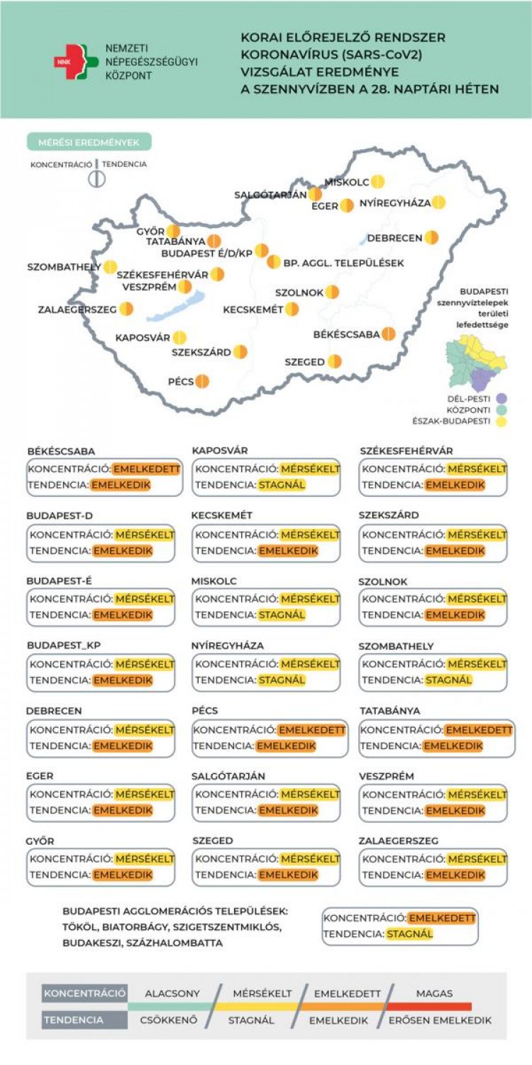 A vírus örökítőanyag koncentrációja négy mintavételi helyen - Békéscsaba, Pécs, Tatabánya és a budapesti agglomerációban - az emelkedett, míg 18 mintavételi helyen a mérsékelt kategóriába esik - írták.