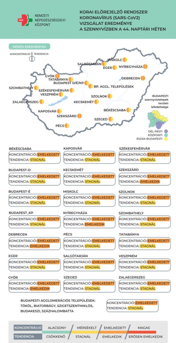 A vizsgált települések közül emelkedő tendencia tapasztalható Debrecenben, Győrben, Nyíregyházán és Szekszárdon, míg a többi településen stagnáló tendencia figyelhető meg. A SARS-CoV-2 örökítőanyag koncentrációja minden mintavételi helyen az emelkedett kategóriába esik.