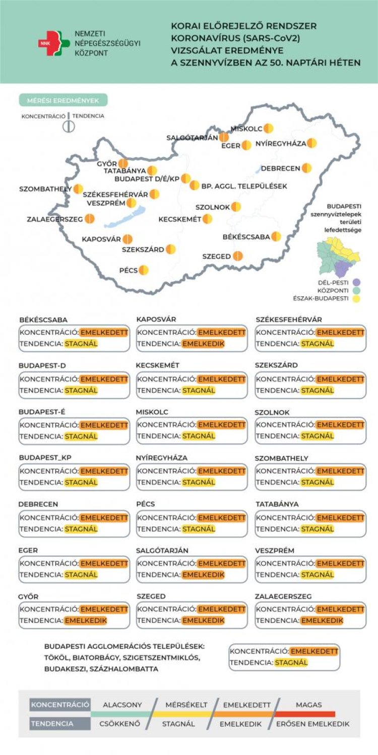 A vizsgált városok többségében stagnáló tendencia tapasztalható, míg emelkedés Győr, Kaposvár, Salgótarján, Szeged és Zalaegerszeg esetében mérhető. A SARS-CoV-2 örökítőanyag koncentrációja változatlanul az emelkedett tartományba esik minden vizsgált mintavételi helyen.