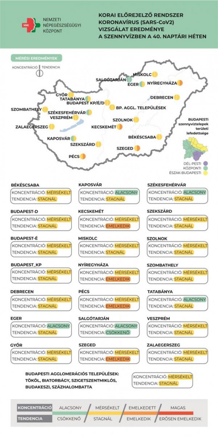 A 40. héten a vizsgált városok közül emelkedés tapasztalható Kecskeméten, Nyíregyházán, Pécsen és Szegeden, míg Salgótarjánban csökkenés látható.