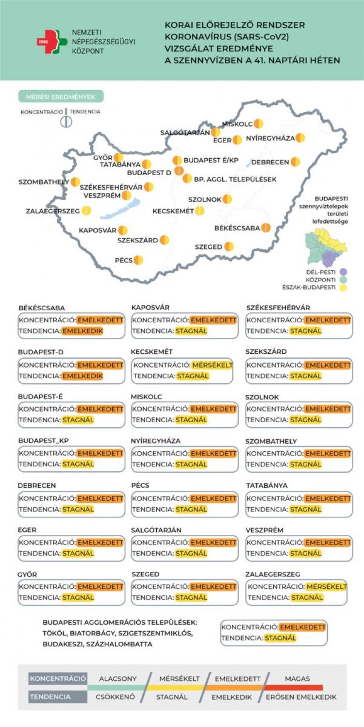 A tendenciát tekintve enyhe emelkedés Békéscsabán és a Dél-pesti Szennyvíztisztító Telep mintáiban tapasztalható, míg a többi helyszín esetében stagnálás jellemző. A szennyvíz SARS-CoV-2 örökítőanyagának koncentrációja két településen − Kecskeméten és Zalaegerszegen − a mérsékelt, míg a többi mintavételi hely esetében az emelkedett kategóriába esik.