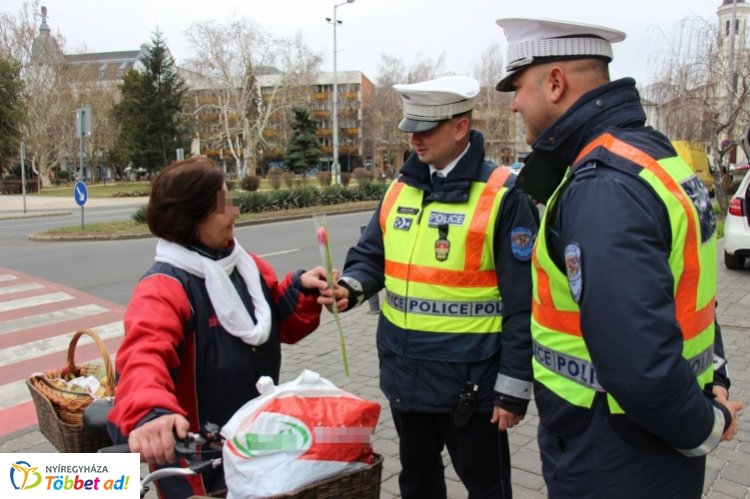 Nőnapra tekintettel a kijelölt gyalogos-átkelőhelyen szabályosan közlekedő, valamint a közúti ellenőrzés alkalmával kifogástalanul megfelelt járművezető hölgyeket a rendőrök jelképesen egy szál virággal ajándékozták meg.