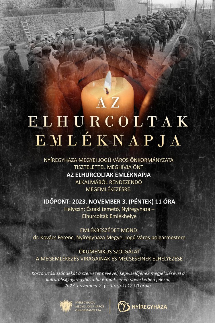 Nyíregyháza Megyei Jogú Város Önkormányzata tisztelettel meghívja a hozzátartozókat, rokonokat, barátokat, leszármazottakat, együttérzőket november 3-án (pénteken), az Elhurcoltak Emléknapja alkalmából rendezett megemlékezésre.