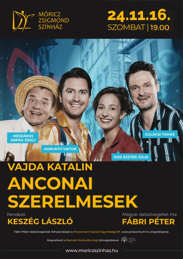 November 16-án, szombaton 19 órakor szombaton újra az Anconai szerelmesek dalai csendülnek fel bérletszünetben a Nagyszínpadon. Napfény, azúrkék ég, tengerpart, fülbemászó dallamok… Mindez együtt Itália, a dolce vita, a szépség és a romantika csodálatos földje, ahol bármi megtörténhet, és gyakorlatilag bármi meg is történik, mégpedig rengeteg szerelem, intrika, félreértés, rekeszizmokat nem kímélő poénok és jól ismert slágerek kíséretében.