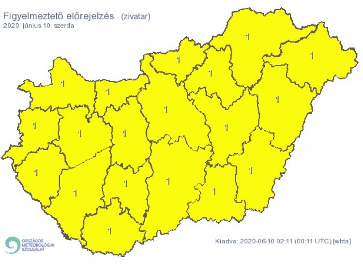 A szolgálat az egész országra elsőfokú figyelmeztetést adott ki zivatar, felhőszakadás miatt pedig Győr-Moson-Sopron, Vas, Veszprém és Zala kivételével minden megyére.