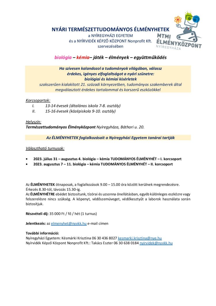 Nyári Természettudományos Élményhetek a Nyíregyházi Egyetem és A Nyírvidék Képző Központ Nonprofit Kft. szervezésében!