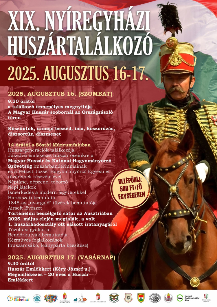 Ismét huszártalálkozót szerveznek Nyíregyházán. Augusztus 16-án egész napos, látványos rendezvényre várják az érdeklődőket. A XIX. Huszártalálkozón idén is az ősi fegyvernemet idézik meg, de a kísérőprogramokon a mai magyar hadseregről is képet alkothatunk. Kóstolhatunk magyaros ételeket, és nem maradnak el a különböző harcászati bemutatók sem. A rendezvény 17-én koszorúzással ér véget.