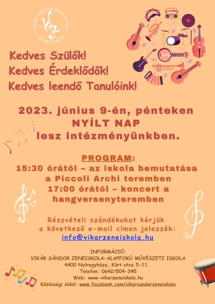 A Vikár Sándor Zeneiskola-Alapfokú Művészeti Iskola 2023. június 9-én, pénteken nyílt napot tart.