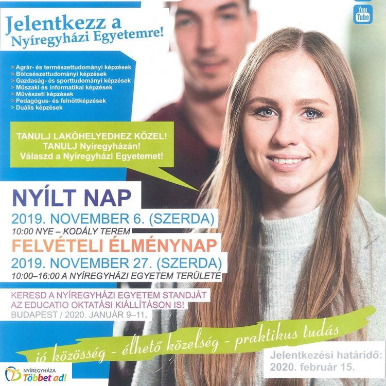 Színes és informatív programokkal teli Nyílt napra várják az érdeklődő végzős középiskolásokat, gimnazistákat, szüleiket, tanárokat a Nyíregyházi Egyetemen, 2019. november 6-án (szerdán) 10:00 órától az egyetem B épületének, Kodály termében.
