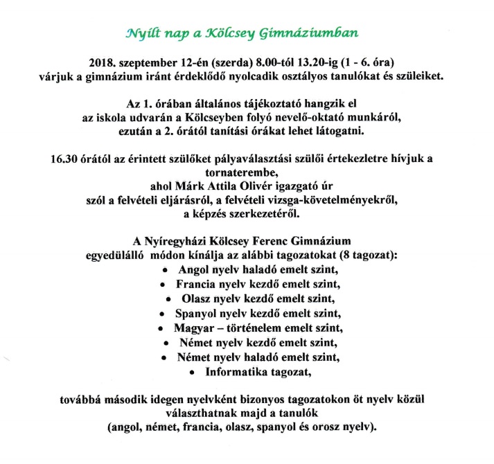 A Nyíregyházi Kölcsey Ferenc Gimnázium nyílt tanítási napot és pályaválasztási szülői értekezletet tart.