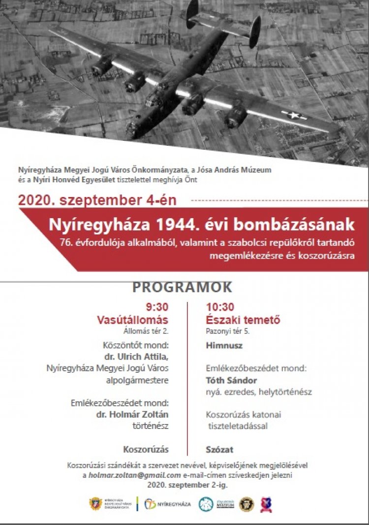 Nyíregyháza 1944. évi bombázásának 76. évfordulója alkalmából a Vasútállomáson és az Északi temetőben is tartanak megemlékezéseket, szeptember 4-én.