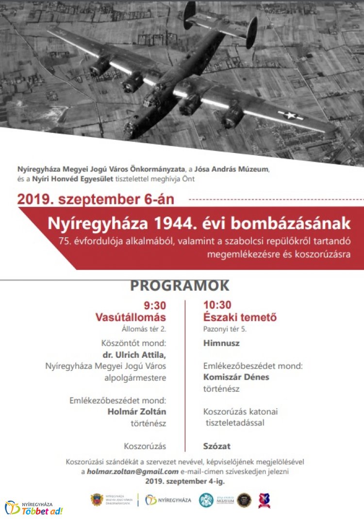 Nyíregyháza 1944. évi bombázásának 75. évfordulója alkalmából a Vasútállomáson és az Északi temetőben is tartanak megemlékezéseket, szeptember 6-án.