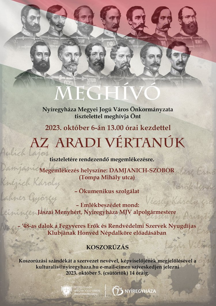 Október 6-án, az aradi vértanúk tiszteletére megemlékezést és koszorúzást tart Nyíregyháza Megyei Jogú Város önkormányzata.