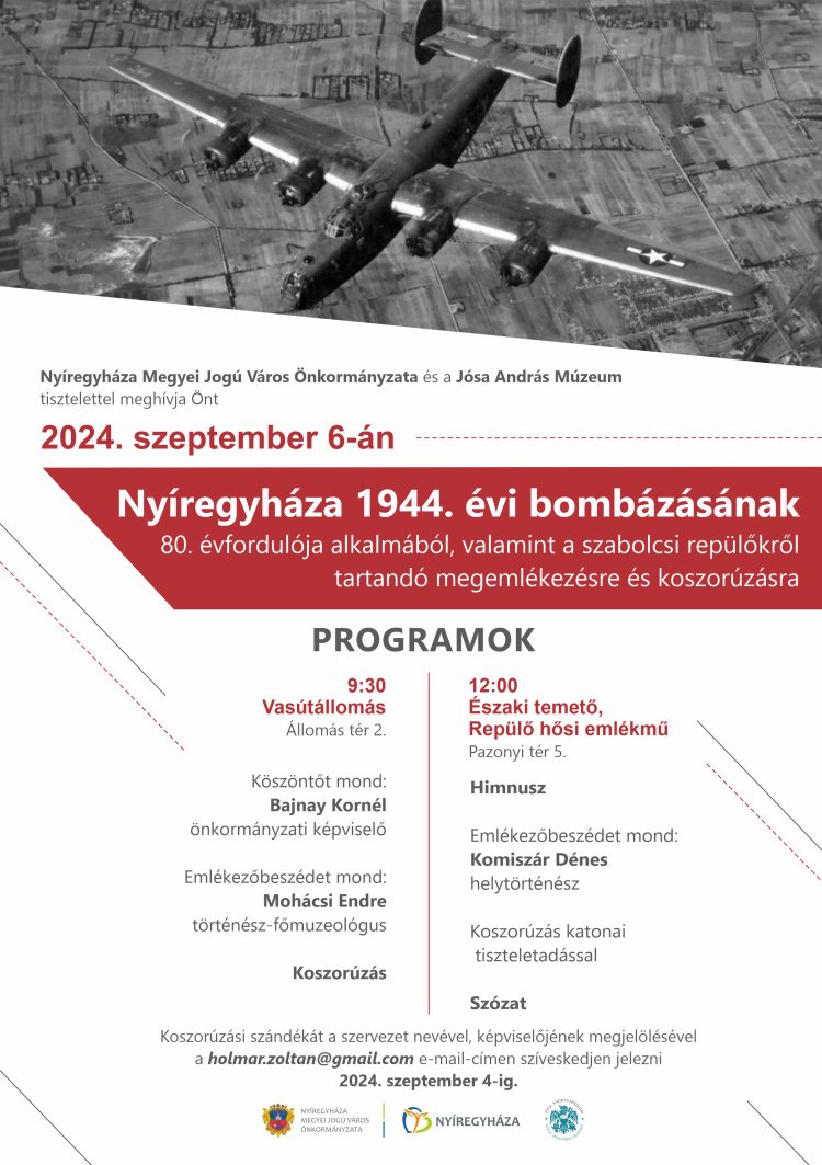 Nyíregyháza Megyei Jogú Város Önkormányzata és a Jósa András Múzeum szeptember 6-án a Nyíregyháza 1944-es bombázásának 80. évfordulója alkalmából megemlékezést és koszorúzást szervez.