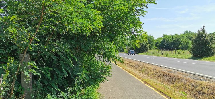 Nyíregyháza és Nyírpazony között a kerékpársávra hajló akácot távolítják el a Magyar Közút dolgozói.