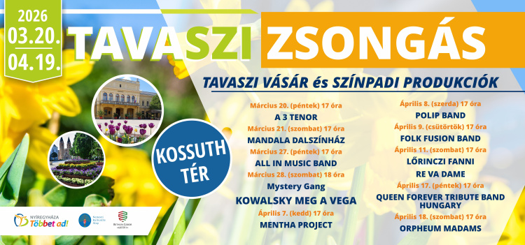 Március 20. és április 19. között újra benépesül Nyíregyháza belvárosa: Nyíregyháza Megyei Jogú Város Önkormányzata idén is meghirdeti a Tavaszi Zsongás programsorozatot. A város egyik legkedveltebb tavaszi eseménye koncertekkel, vásári hangulattal, kiállításokkal és húsvéti családi programokkal várja a nyíregyháziakat és az idelátogatókat.