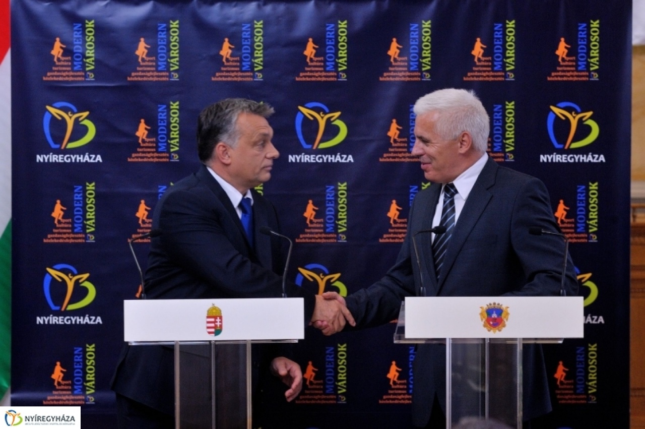 A városházán Orbán Viktor miniszterelnök és dr. Kovács Ferenc polgármester látta el névjegyével azt a szerződést, amely a magyar kormány és a nyíregyházi önkormányzat között jött létre. Ebben a dokumentumban rögzítették, melyek azok a kiemelt beruházások, amelyek a Modern Városok Program keretében uniós és hazai forrásokat kaphatnak. A miniszterelnök ezt követően részletesen is ismertette a megállapodást. Pontokba szedve jelentette be a beruházásokat.