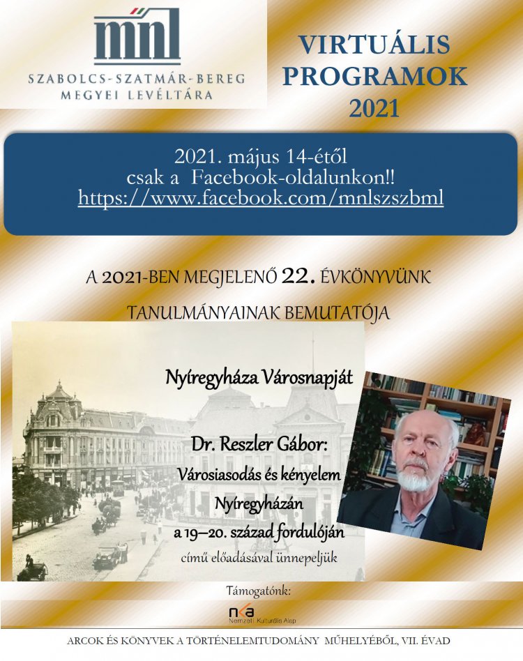 Folytatódik a Szabolcs-Szatmár-Bereg Megyei Levéltár 2021-ben megjelenő évkönyve tanulmányainak bemutatója. Május 14-től az intézmény Facebook-oldalán dr. Reszler Gábor: Városiasodás és kényelem Nyíregyházán a 19-20. század fordulóján című előadása is elérhető.