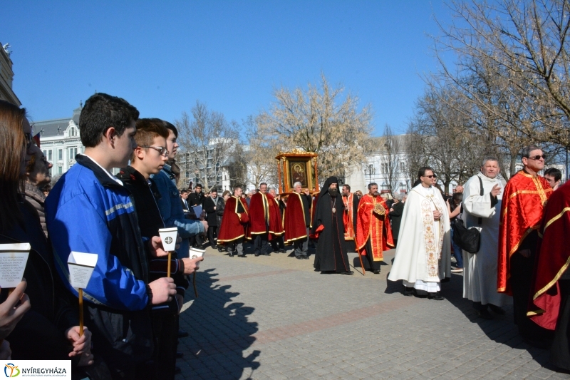 A Mária-kegyképet a Kossuth téren a város és az egyházak elöljárói köszöntötték, majd átkísérték a Görögkatolikus Társszékesegyházba.