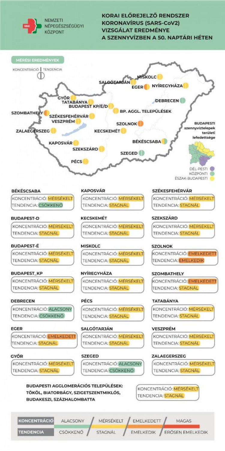 Emelkedő tendenciát egyedül Szolnok esetében figyeltek meg. A vizsgálatok alapján elmondhatjuk, hogy az átlagosnál magasabb a koncentráció Eger, Szolnok és Szombathely esetében. Csökken azonban a koncentráció Békéscsabán, Debrecenben és Szegeden. Ezzel Debrecenben és Szegeden ismét alacsony szintre csökkent az új koronavírus koncentrációja.