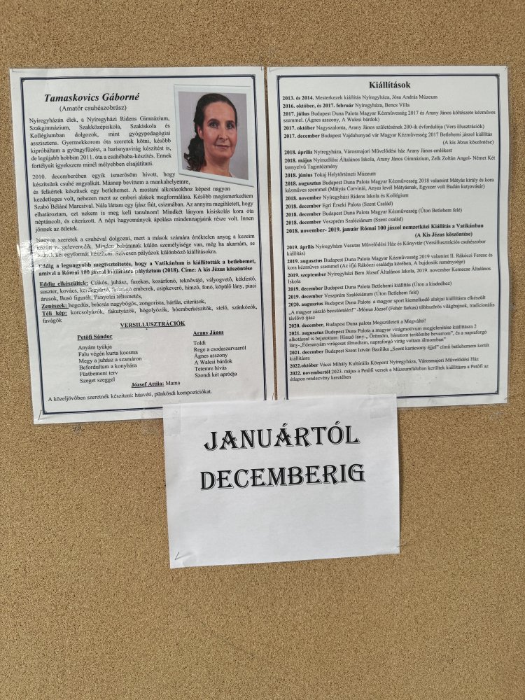 Többek között Petőfi Sándor Szeget szeggel, Anyám tyúkja és Megy a juhász szamáron című alkotása ihlette Tamaskovics Gáborné csuhé alkotásait, amiket bárki megtekinthet az iskola nyitvatartási idejében a Nyíregyházi RIDENS Gimnázium, Szakiskola és Kollégiumban november 18-ig.