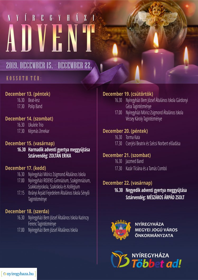 December 22-ig a hét minden napján programokkal várják a városlakókat és az ide látogatókat a Kossuth téren. Ezüstvasárnap, a harmadik adventi gyertya meggyújtását követően Zoltán Erika szórakoztatja az érdeklődőket, míg aranyvasárnap Mészáros Árpád Zsolt műsora zárja az adventi programsorozatot.