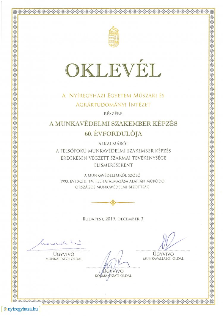 2019. december 3-án Dr. Sikolya László tanszékvezető, főiskolai tanár, szakfelelős vette át a Budapesti Műszaki és Gazdaságtudományi Egyetemen, a Munkavédelmi Szakember Képzés 60. évfordulója alkalmából rendezett konferencián - Bodó Sándor Foglalkoztatáspolitikáért felelős államtitkár jelenlétében - Dr. Nesztinger Péter munkavédelmi főosztályvezetőtől azt az oklevelet, mellyel elismeri a Nyíregyházi Egyetem Műszaki és Agrártudományi Intézetben folyó felsőfokú munkavédelmi szakember képzés érdekében végzett szakmai tevékenységet.