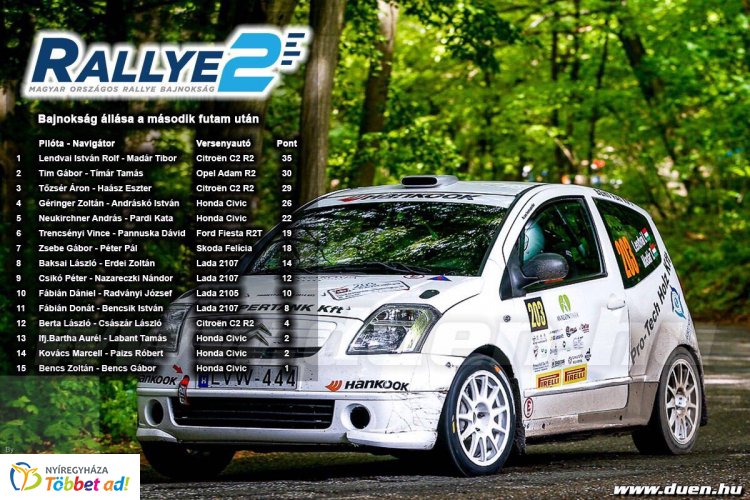- Sajnos a következő gyorsasági előtt hibáztunk a navigátorommal és kaptunk 1 perc büntetést. Az 1 perc büntetés után a 18. helyre csúsztunk vissza. Innen kezdtük a felzárkózást, ami nagyon nem egyszerű ilyen sok jó és ügyes pilóta mellett. Elég változó körülmények között zajlott a verseny, az erdőben sokkal nehezebben tudott felszáradni a pálya igy sok helyen sáros volt a pálya, néhol vizes néhol meg száraz. Szóval nagyon összetett verseny volt igazi rally pályákon, és négy szakaszt megnyertünk. Úgy döntöttünk a navigátorommal, hogy csakis kivárásra autózunk, a biztonságos célba érkezésre törekedtünk, de olyan jó tempót tudtunk közben diktálni, hogy gyorsaságiról gyorsaságira sikerült előrébb lépkednünk és a verseny legvégén mindössze 6,1 másodperccel előzött meg minket a verseny győztese. Ezt annak is köszönhettük, hogy több versenyzőtársunk idő előtt búcsúzott, aminek mi nem örültünk - mondta Lenvai István.