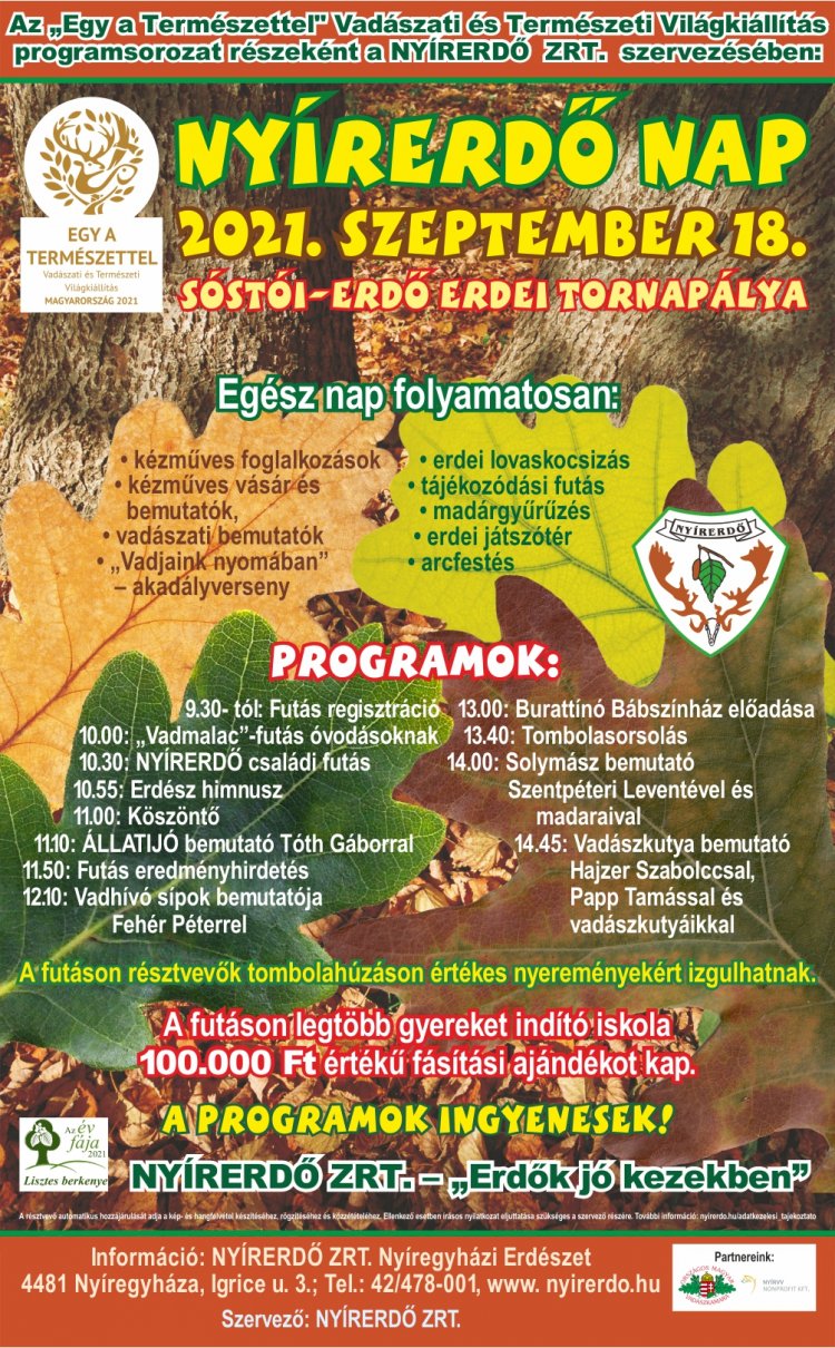Az „Egy a Természettel" Vadászati és Természeti Világkiállítás programsorozat részeként a NYÍRERDŐ Zrt. szervezésében NYÍRERDŐ Nap lesz 2021. szeptember 18-án, Nyíregyházán, a Sóstói-erdőben, az Erdei Tornapályánál.