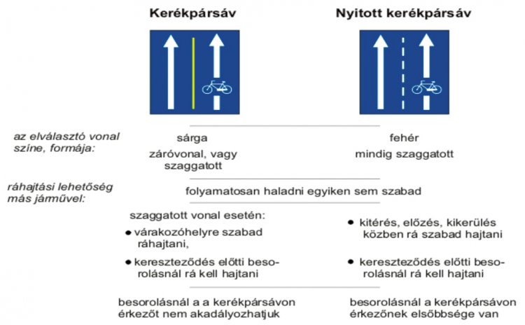 Az alábbi ábra mutatja a kerékpársávra és a nyitott kerékpársávra vonatkozó szabályok közötti különbséget: