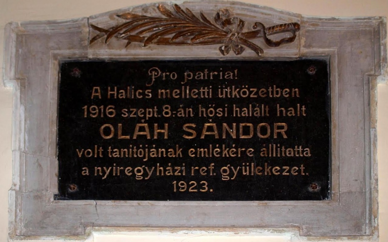 A Nyírvidék 1917. március 24-ei számában Oláh Sándor halálhírérõl tudósított: „Oláh Sándor nyíregyházi református tanító, harmincöt éves korában, házasságának ötödik évében, 1916. szeptember 8-án a Halics elõtt vívott ütközetben ellenséges srapneltõl homlokon találva hõsi halált halt. Bajtársai ideiglenesen Bolszovce közelében temették el”. Öt évvel késõbb szívszélhûdésben a felesége is elhunyt.