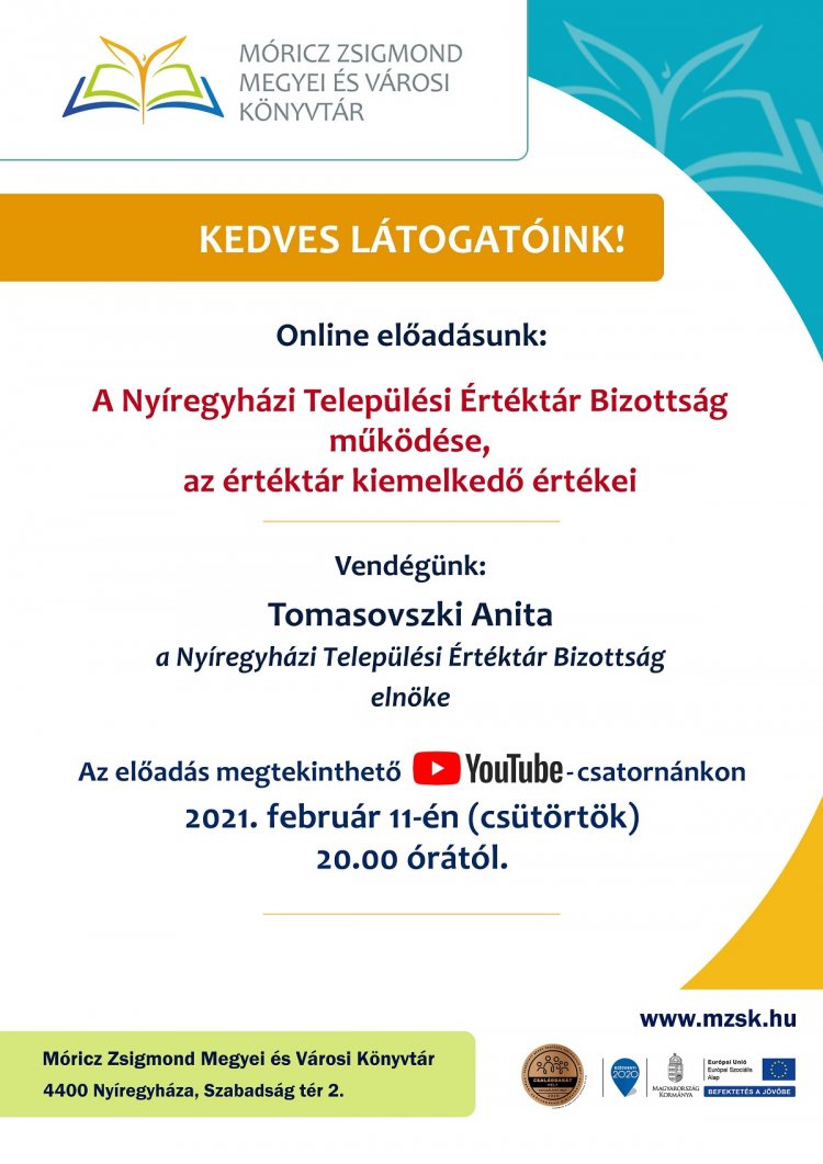 A Nyíregyházi Települési Értéktár Bizottság működéséről, az értéktár kiemelkedő értékeiről tart előadást Tomasovszki Anita február 11-én, amely megtekinthető a Móricz Zsigmond Megyei és Városi Könyvtár YouTube-csatornáján.