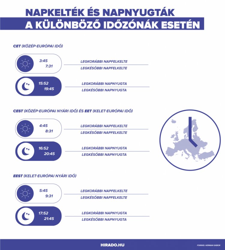 Nem megvalósíthatatlan, de szélsőséges lehetőség az EEST-re, azaz a kelet-európai nyári időzónára átállás. Ebben az esetben lenne olyan nap, amikor a mostaninál jóval később világosodna, de néhány sötét reggelért cserébe a legkorábbi napnyugta is csak este 6 óra környékére tehető, viszont nyáron lenne olyan esténk, amikor este tíz óra körül megy csak le a nap.