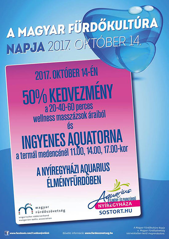 Hagyományosan minden évben október második szombatján ünnepeljük a Magyar Fürdőkultúra Napját. Ezen alkalomból október 14-én valamennyi tisztelt Vendégünk 50% kedvezménnyel veheti igénybe az Aquarius Élményfürdő fürdőgyógyászatán a 20-40-60 perces wellness masszázsokat!Mindemellett a földszinti termálvilágban 11.00, 14.00 és 17.00 órai kezdettel ingyenes aqua-tornán vehetnek részt tisztelt vendégeink